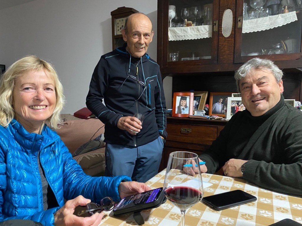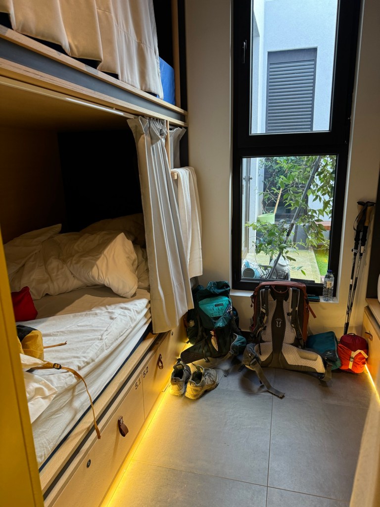 Så den siste månaden hadde eg to ull-T-skjorter, ein langarma, tynn ullgensar, to sett undertøy, tre par labbar (eitt par av ull), ein shorts, ei lett turbukse, og ytterjakke. Ullbuffer, lang, tynn ullbukse (den fekk eg aldri bruk for) og hanskar (i silke) kjøpte eg også etter kvart.