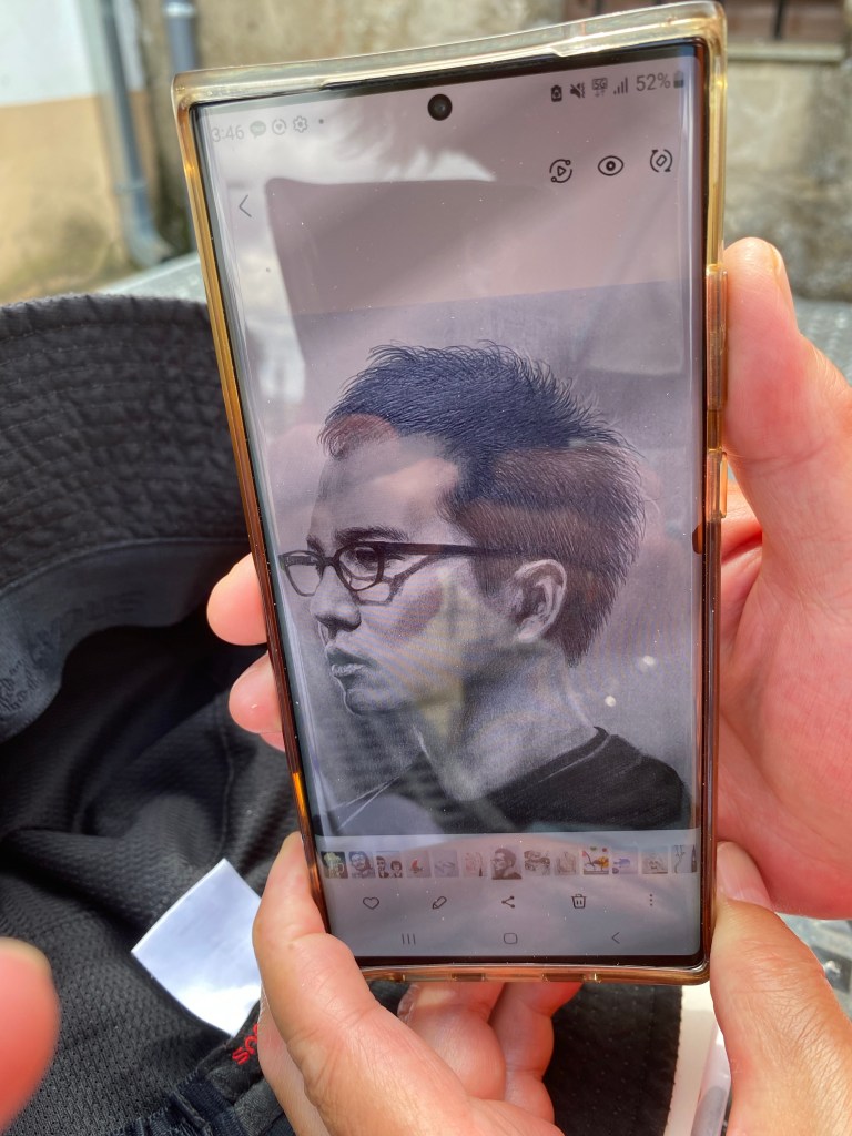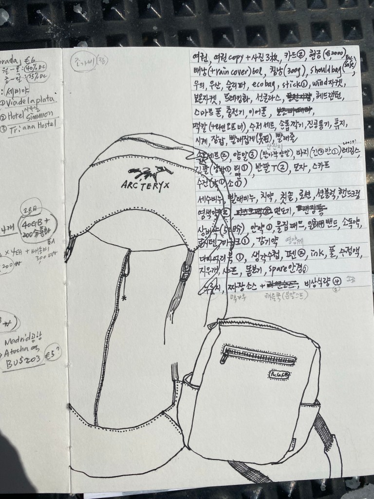 Fekk gleda av å bli meir kjent med Jian, pensjonert arkitekt frå Sør-Korea. Eg har sove på same Albergue som han og reisekameraten, og har sett at han kvar ettermiddag sit og skriv i ei bok. No fekk eg sjå den, eg blei mållaus. Reine kunstverket! Og han er verkeleg ein kunstnar. Eg fekk sjå alle bileta han har teikna opp gjennom åra, fantastisk flink og kreativt. Og han gjer det berre for seg sjølv. Ville ikkje høyre snakk om å ha utstilling.